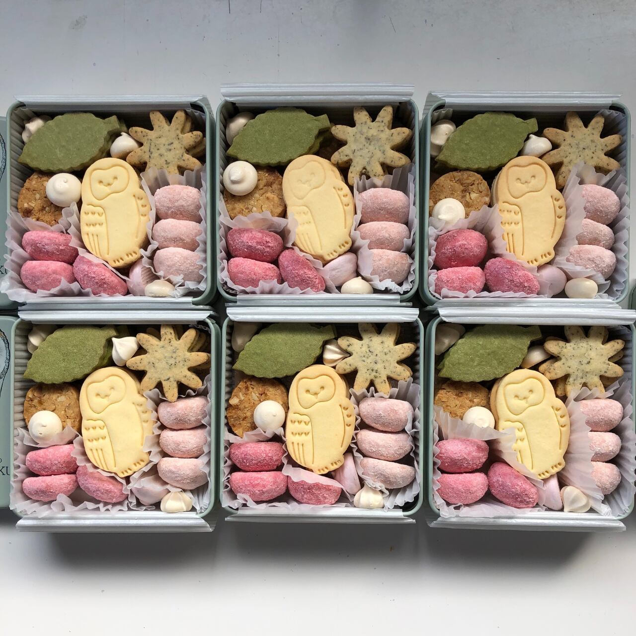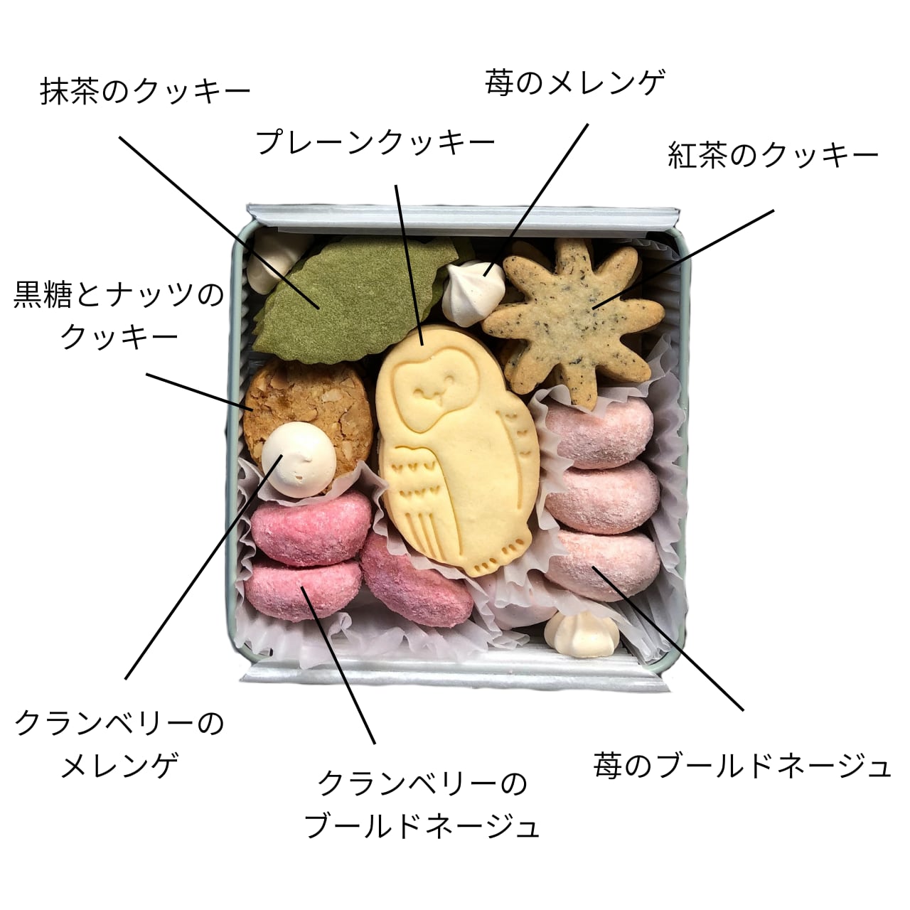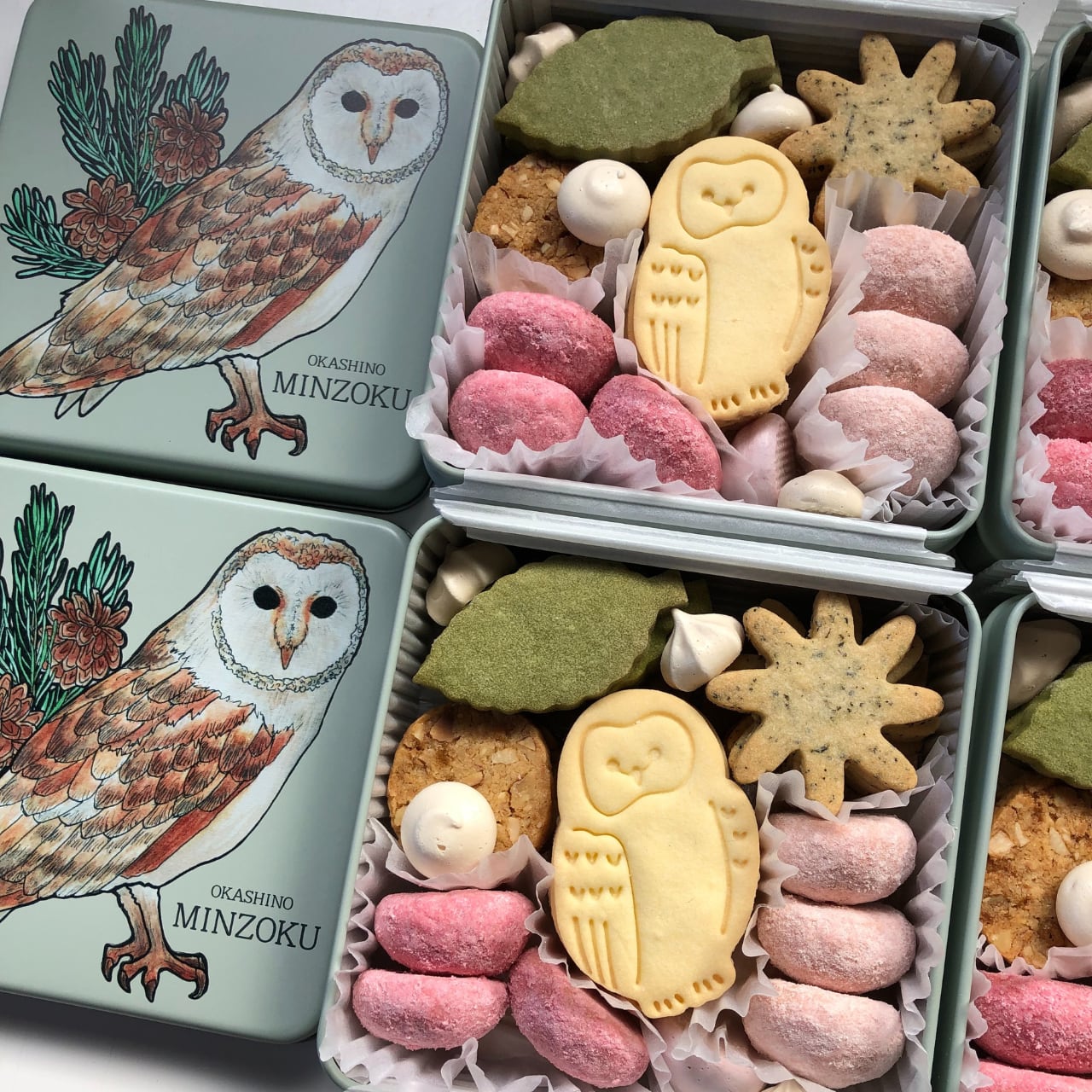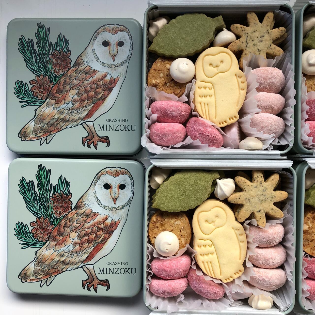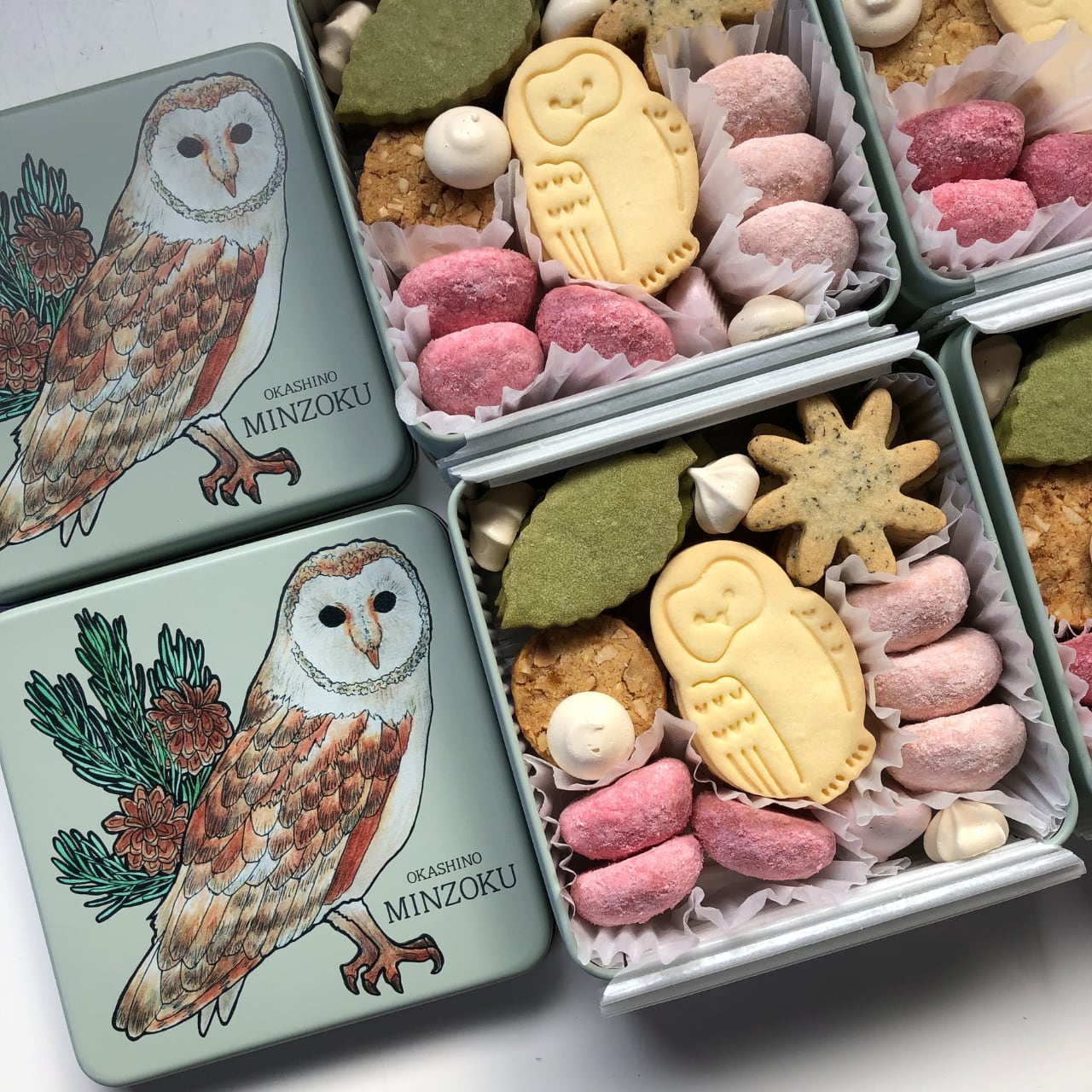 素材にこだわったクッキー缶です。北海道産小麦、てんさい含蜜糖などを使用し、素朴でありながら風味豊かなクッキーに仕上げました。缶のデザインには、オリジナルでフクロウのイラストを描きました。